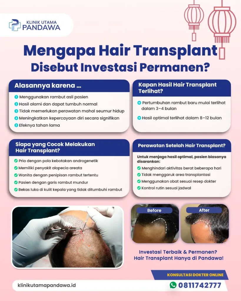 Jika Anda sedang mempertimbangkan prosedur ini, Klinik Utama Pandawa dapat menjadi pilihan untuk melakukan konsultasi dan pemeriksaan awal. Dengan penanganan oleh tenaga medis profesional serta peralatan modern, pasien akan mendapatkan evaluasi menyeluruh sebelum tindakan dilakukan. Prosesnya diawali dengan analisis kondisi rambut dan kulit kepala untuk memastikan Anda merupakan kandidat yang tepat.