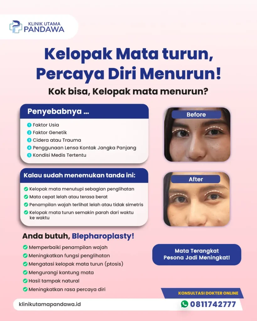 Jika kelopak mata turun mulai mengganggu penampilan atau kenyamanan penglihatan, blepharoplasty di Klinik Utama Pandawa dapat menjadi solusi yang tepat. Ditangani oleh dokter berpengalaman dengan pendekatan medis yang aman dan terukur, prosedur ini dirancang untuk memperbaiki posisi kelopak mata sekaligus memberikan hasil yang terlihat alami. Melalui konsultasi menyeluruh, setiap tindakan disesuaikan dengan kondisi dan kebutuhan Anda, sehingga prosesnya lebih tenang, nyaman, dan hasilnya optimal. Jangan ragu untuk mengambil langkah awal menuju mata yang lebih segar dan percaya diri bersama Klinik Utama Pandawa.