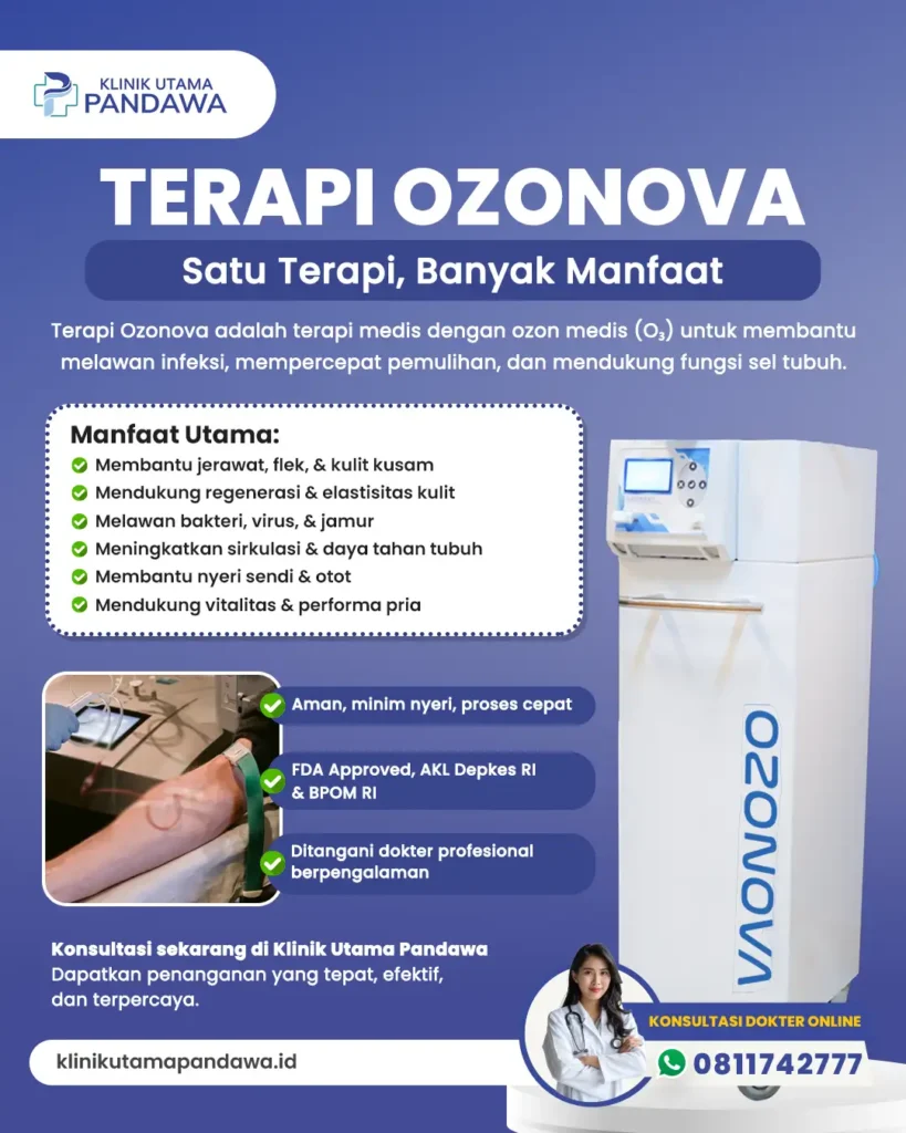 Ingin tubuh lebih segar dan sehat secara menyeluruh? Terapi Ozonova di Klinik Utama Pandawa hadir sebagai solusi modern untuk mendukung sistem kekebalan tubuh, mempercepat regenerasi sel, dan meningkatkan vitalitas Anda. Dengan prosedur yang aman dan diawasi tenaga medis profesional, setiap sesi terapi dirancang sesuai kebutuhan kesehatan Anda, sehingga manfaatnya bisa dirasakan secara optimal.