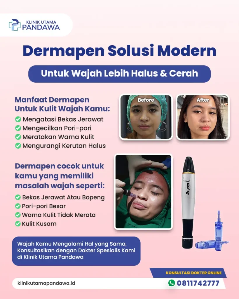 Kalau kamu ingin melakukan Dermapen dengan aman, nyaman, dan hasil yang memuaskan, Klinik Utama Pandawa adalah tempat yang tepat! Didukung oleh tim medis berpengalaman dan teknologi modern, setiap pasien akan mendapatkan perawatan yang sesuai dengan kebutuhan kulitnya. Bukan cuma Dermapen, Klinik Utama Pandawa juga menyediakan berbagai layanan estetika dan antiaging perawatan kulit lainnya seperti chemical peeling, PRP, facial acne, dan masih banyak lagi.