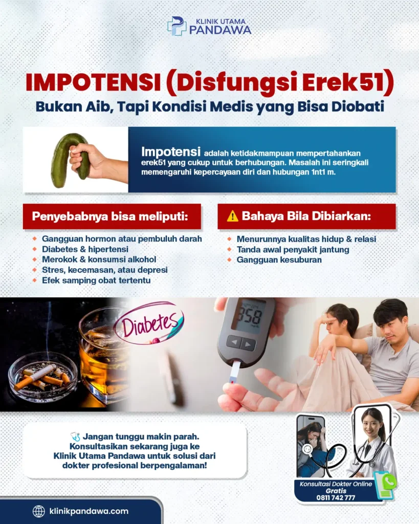 Didukung oleh layanan andrologi di klinik utama pandawa, setiap pasien ditangani oleh tenaga medis berpengalaman dengan pendekatan personal dan berbasis medis. Jangan biarkan disfungsi ereksi mengganggu kepercayaan diri dan keharmonisan hubungan Anda. Segera ambil langkah bijak hari ini dan kembalikan performa pria secara sehat, aman, dan berkelanjutan.